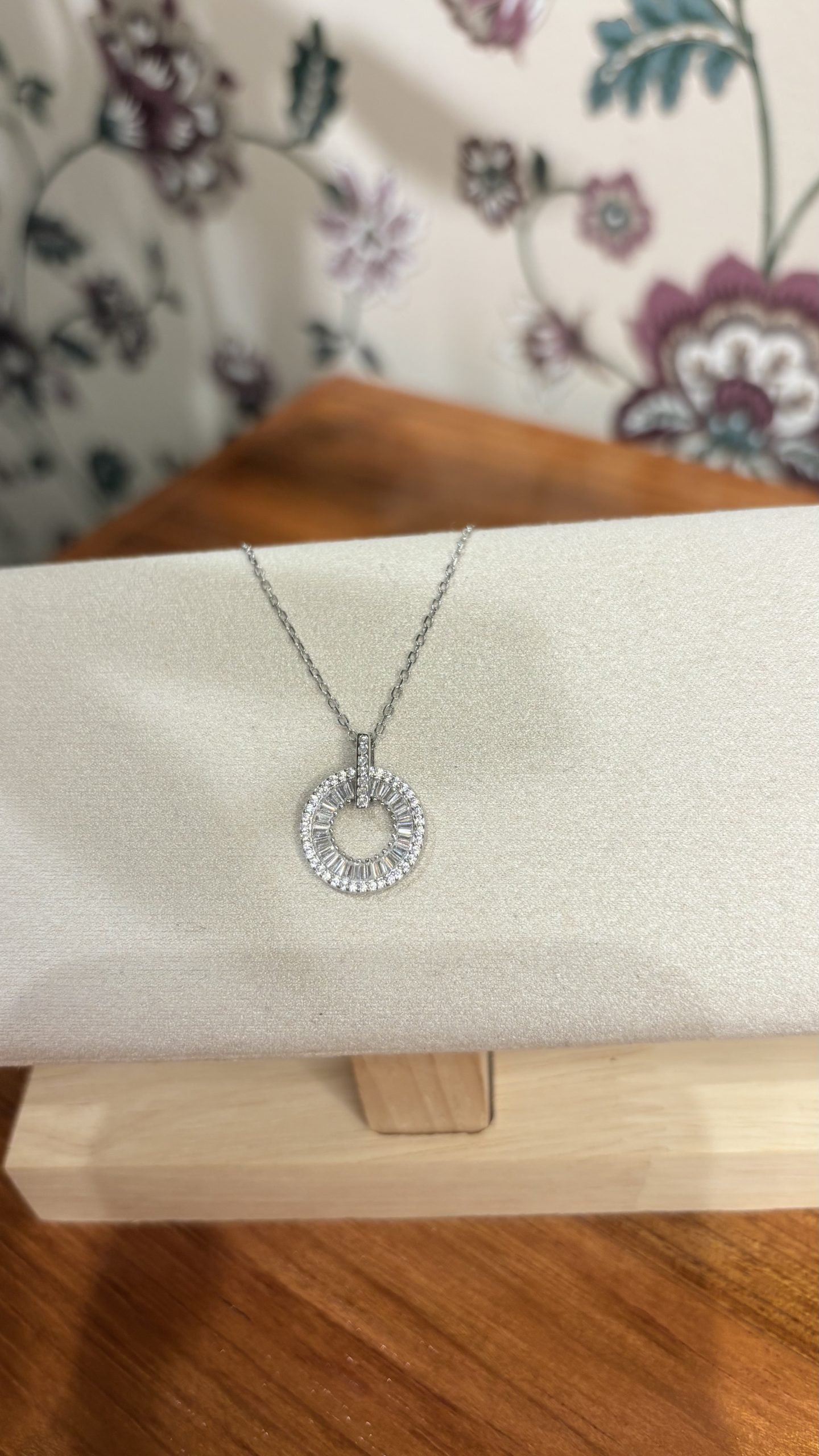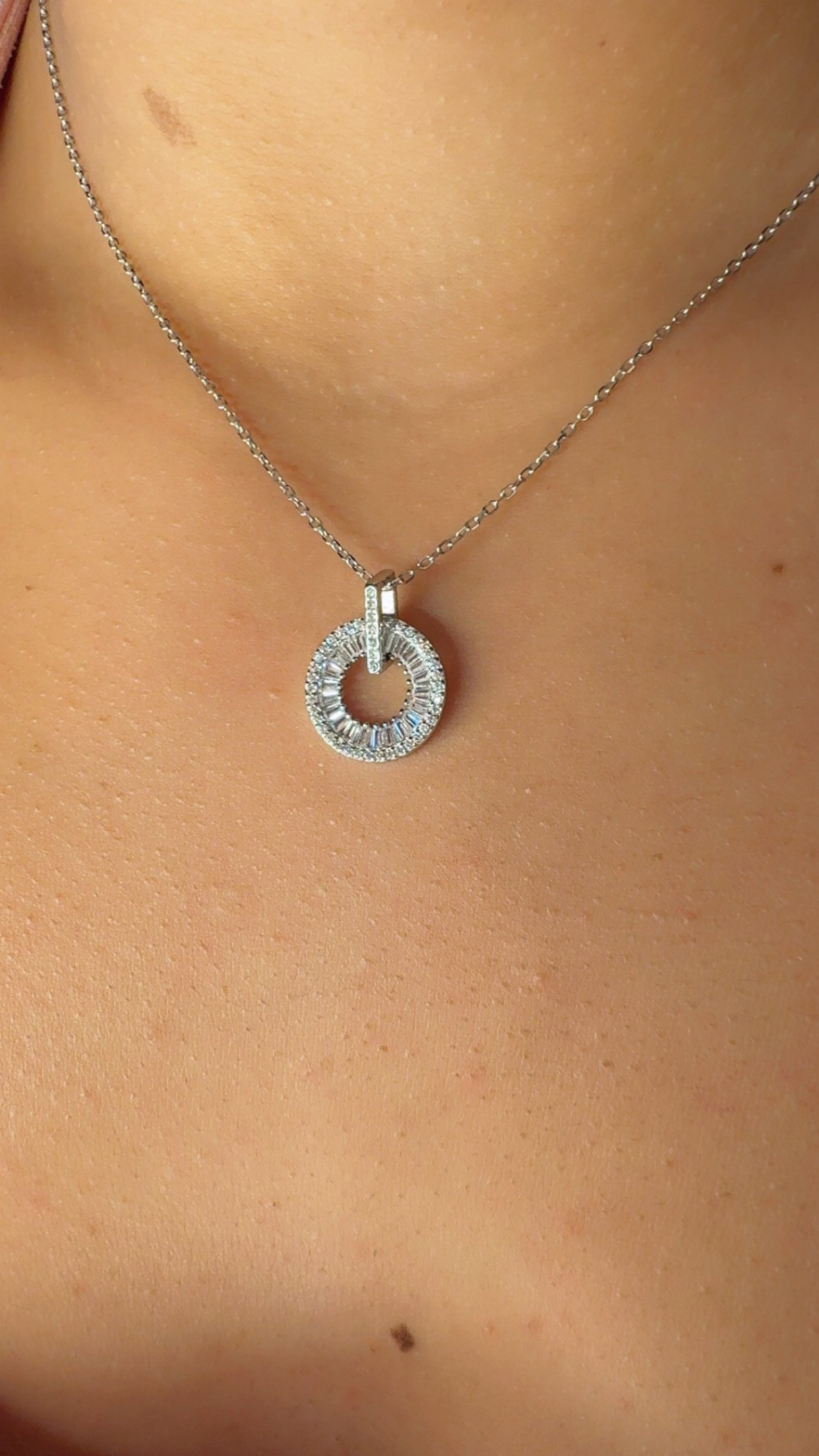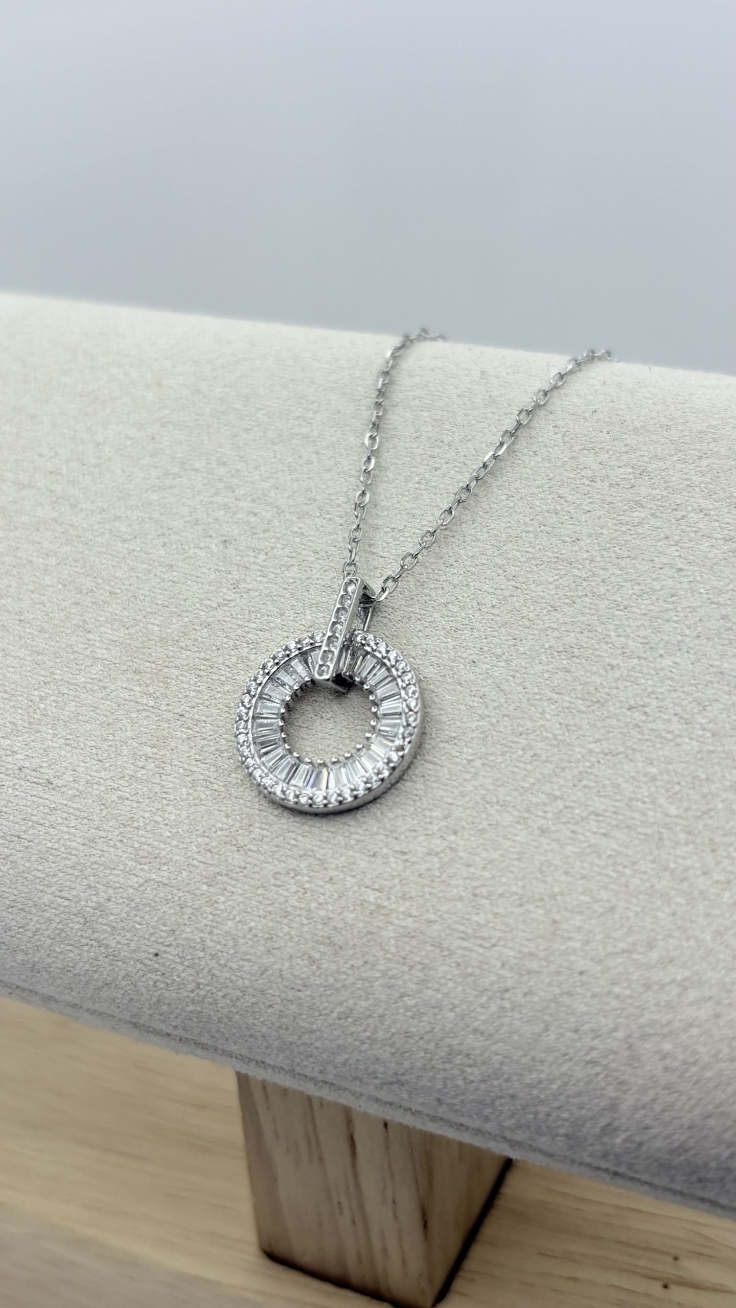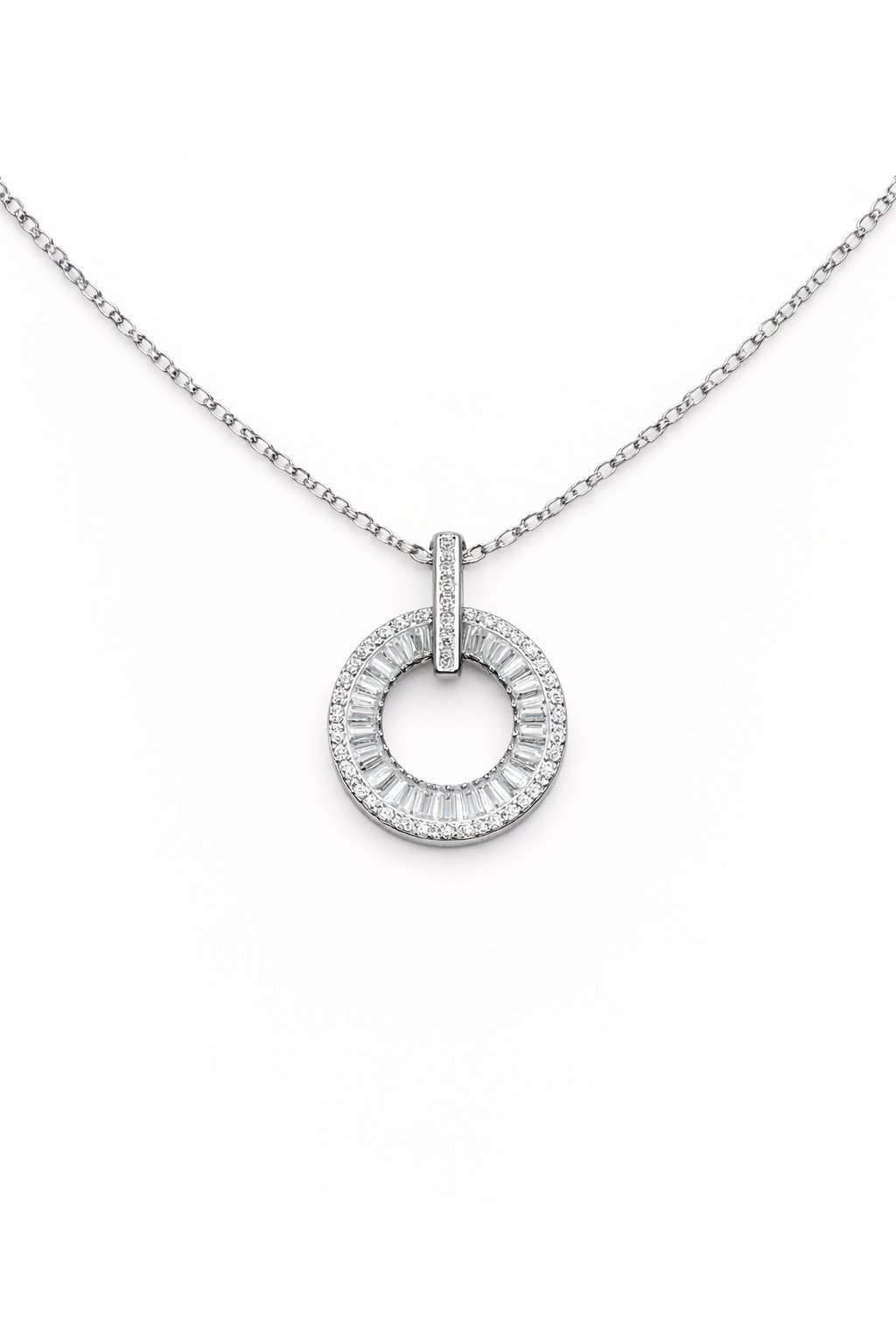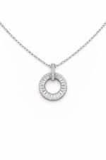 Collar en Plata 925 con dije redondo, laterales con trapecios de circones blancos.