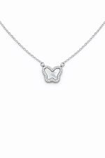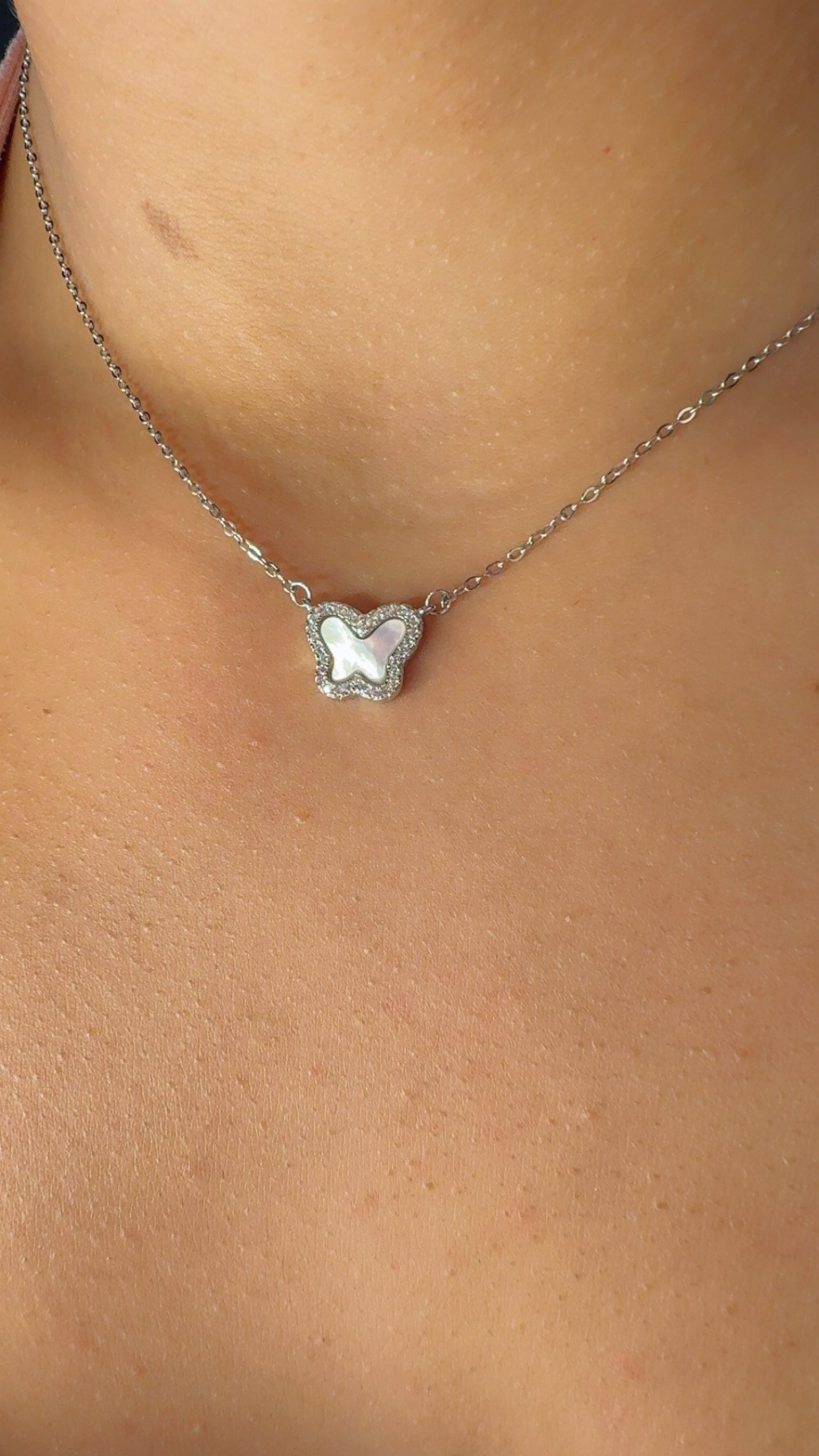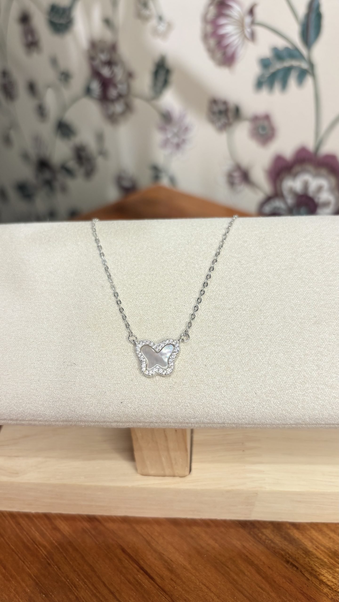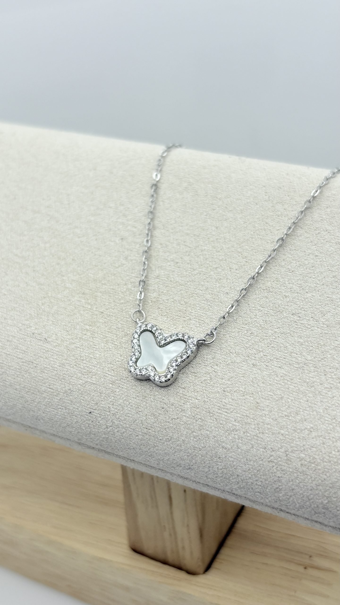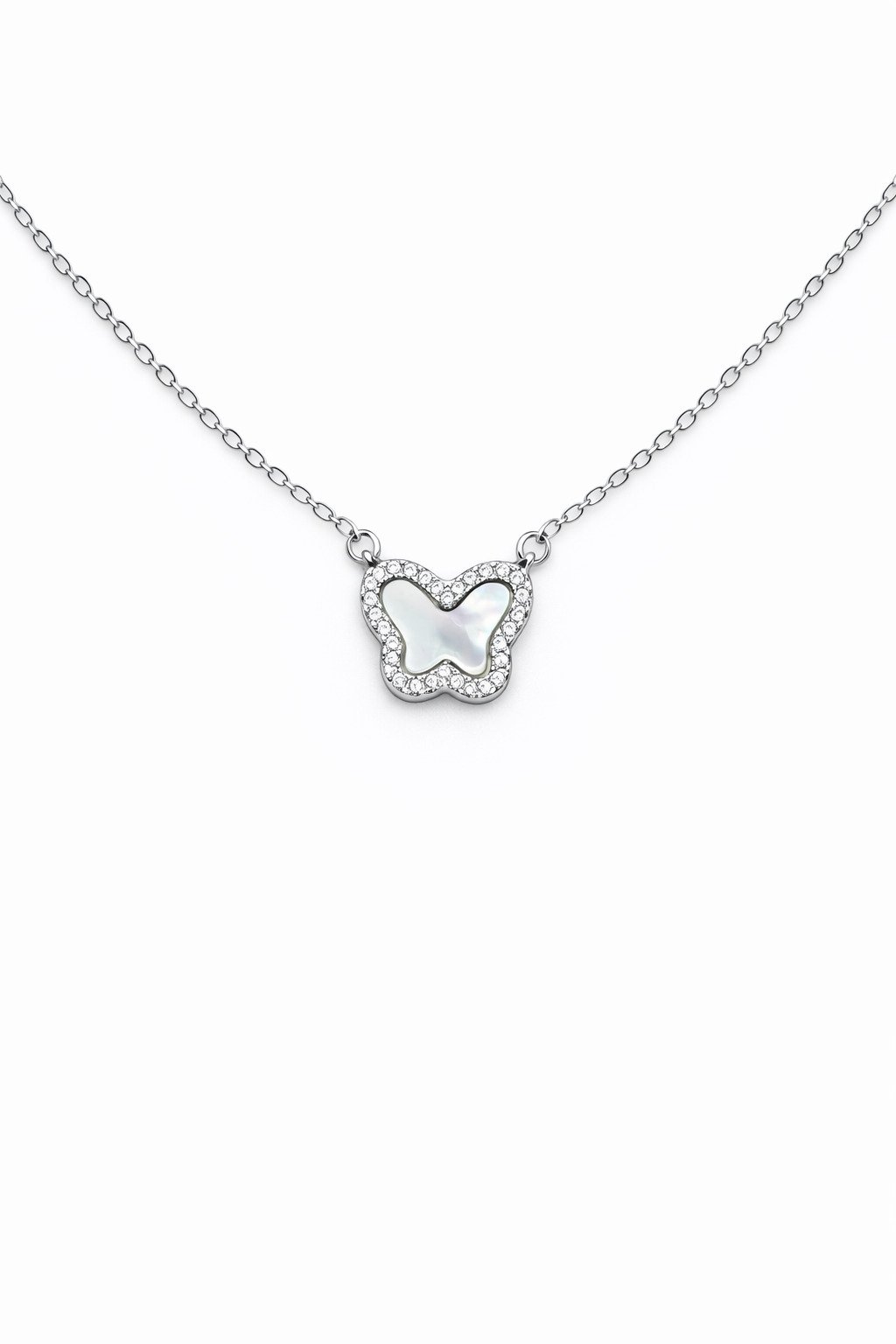 Collar en Plata 925 con dije de mariposa, 10 mm, centro de Perla con bordes de circones blancos.